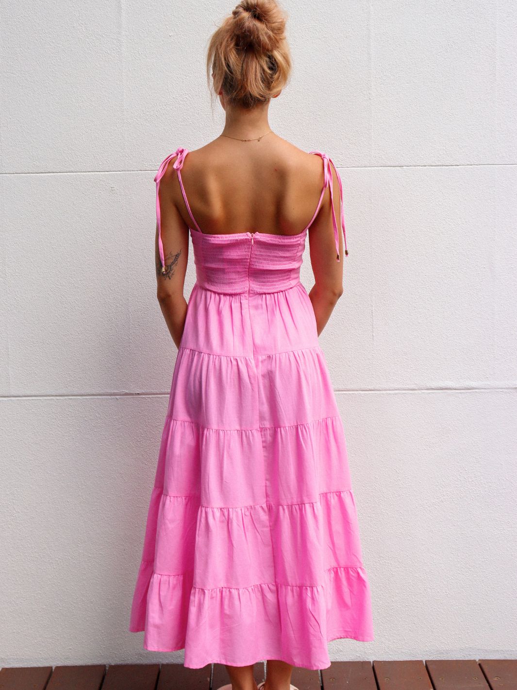 TIERED TWIST MIDI - a Privvy classic, dress with a twist! The bust features a unique twist detail, the full tiered skirt and string tie straps with metal details. The elasticated back ensures a perfect fit.