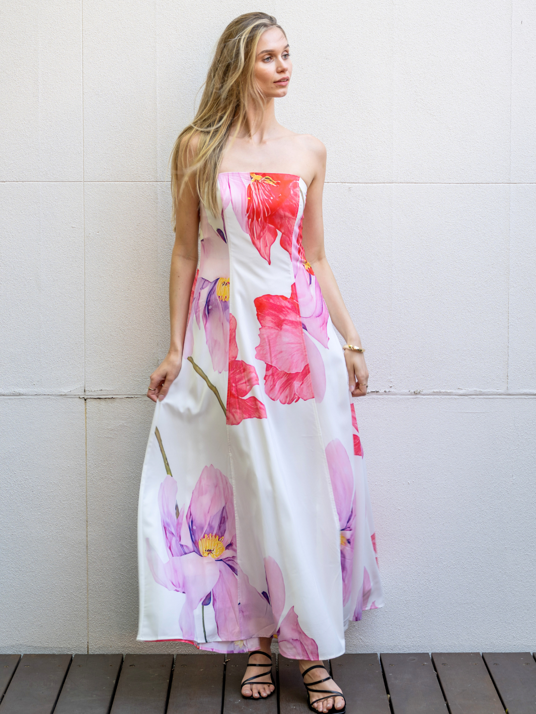 Introducing the Orla Strapless Dress - bold, elegant, and made to turn heads. Cut in a structured strapless silhouette, it features soft shaping through the bodice and a full A-line skirt that drapes beautifully with every step. Designed in a statement floral print, it’s a striking occasion style dress with effortless movement and charm. Perfect for celebrations, long lunches, or summer events.