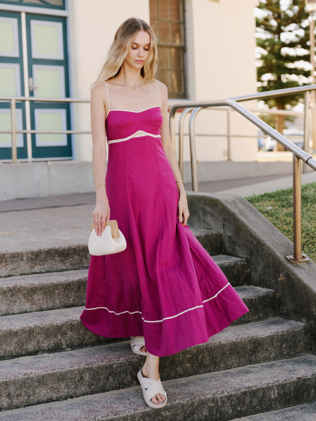 Introducing the Braid Strap Maxi - elegant, full of feminine ease and guaranteed to add a pop of colour to your wardrobe. Designed with contrast braided straps and a soft sweetheart neckline, it features subtle cut-out detailing and a full, floaty skirt. It's a statement piece you'll reach for on warm days, holiday evenings, or any moment that calls for something a little extra.