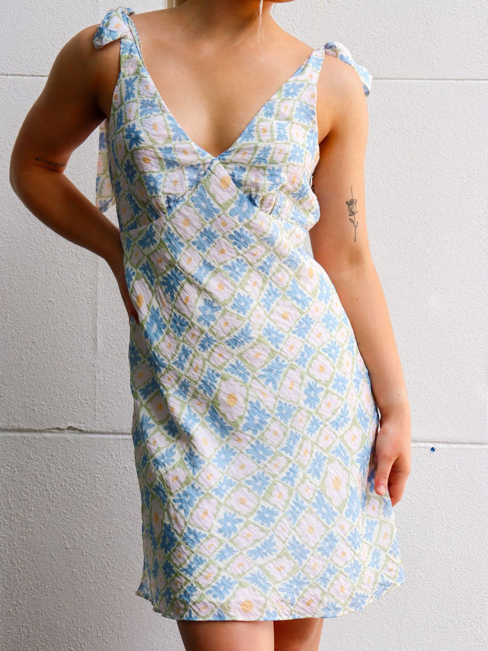 The VIOLET TIE MINI is the perfect addition to your wardrobe. Designed with an A-line mini cut and shoulder ties, this dress offers a retro floral tile print and a bias cut for a flattering fit.